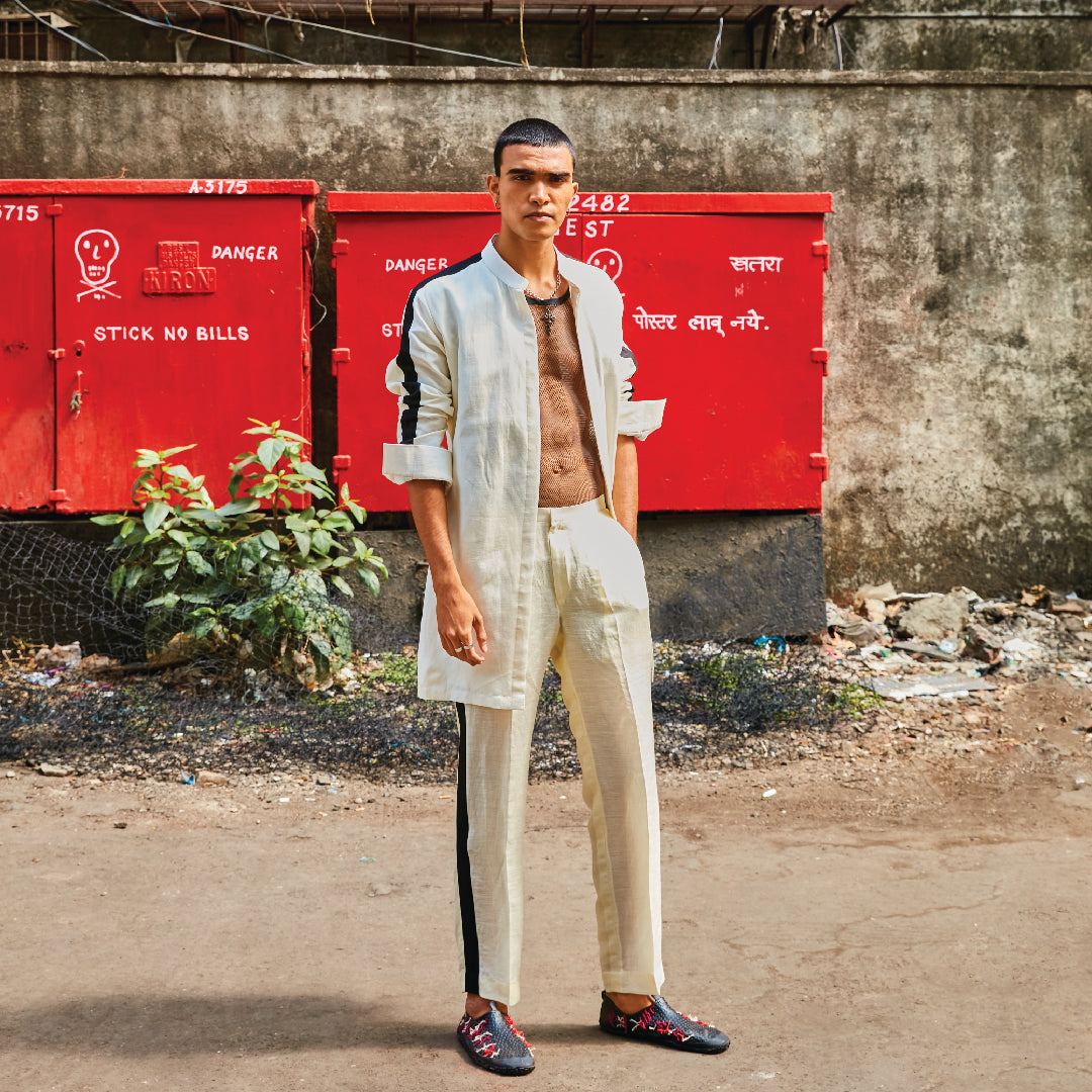 Featuring a white linen kurta with black stripes on the shoulder teamed with pants