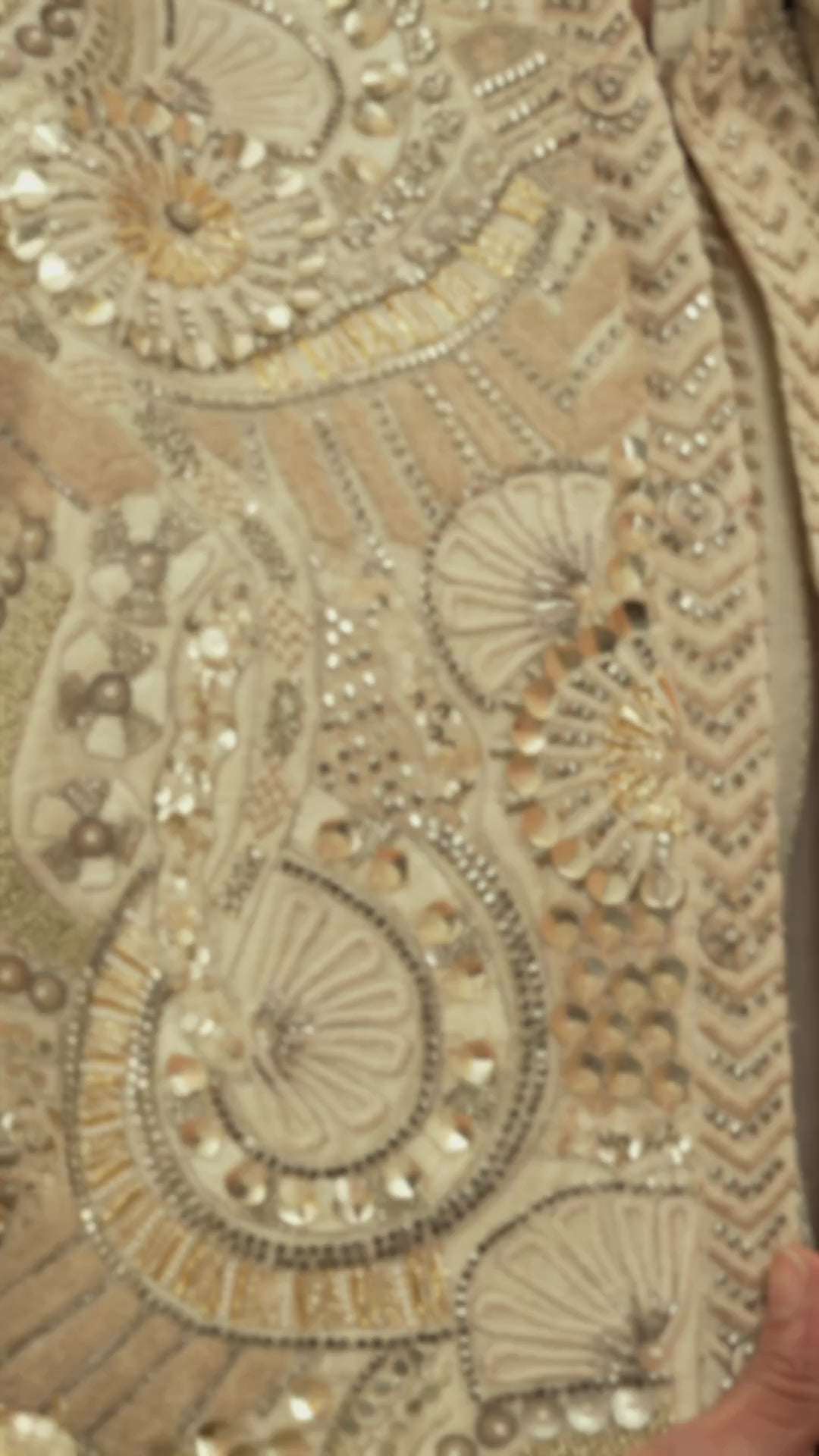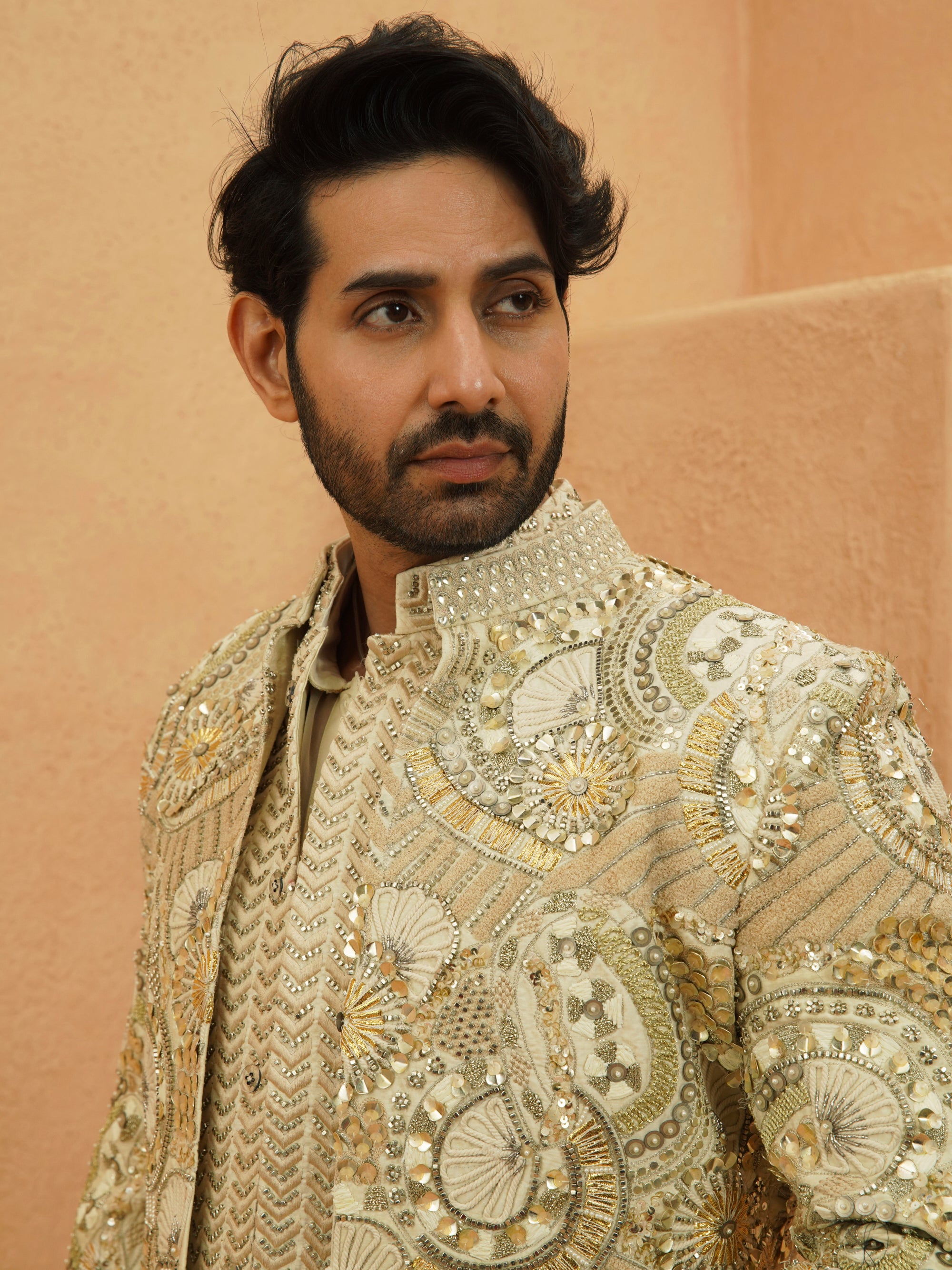 This opulent ensemble features a sherwani and trousers in a regal ivory and gold palette. The sherwani is adorned with intricate hand-embroidered motifs, blending paisley and floral elements with shimmering sequins and beadwork. This ensemble can be styled with bundi and kurta set for added allure as seen in the image. Perfect for a grand wedding or festive occasion, this outfit exudes timeless sophistication and royal charm.