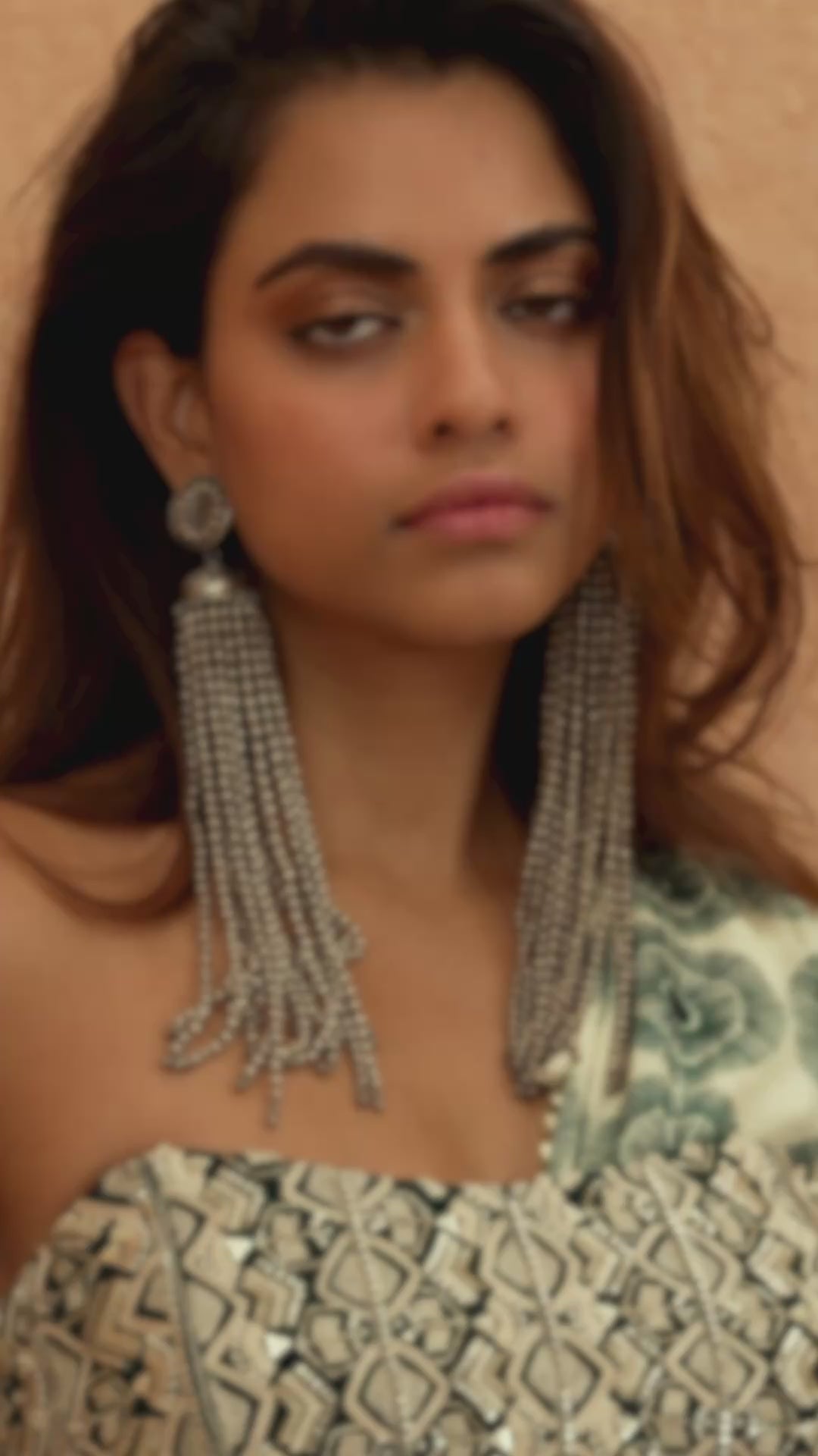 This ensemble features a strapless, intricately embellished corset paired with a drape saree showcasing protea motifs. The fusion of metallic detailing and fluid silhouettes creates a modern yet elegant look, perfect for festive or special occasions.