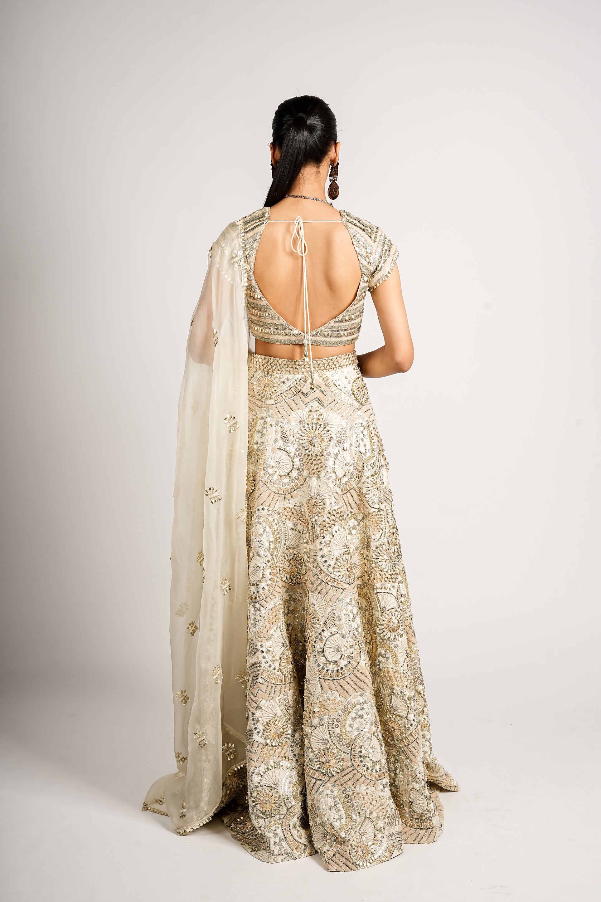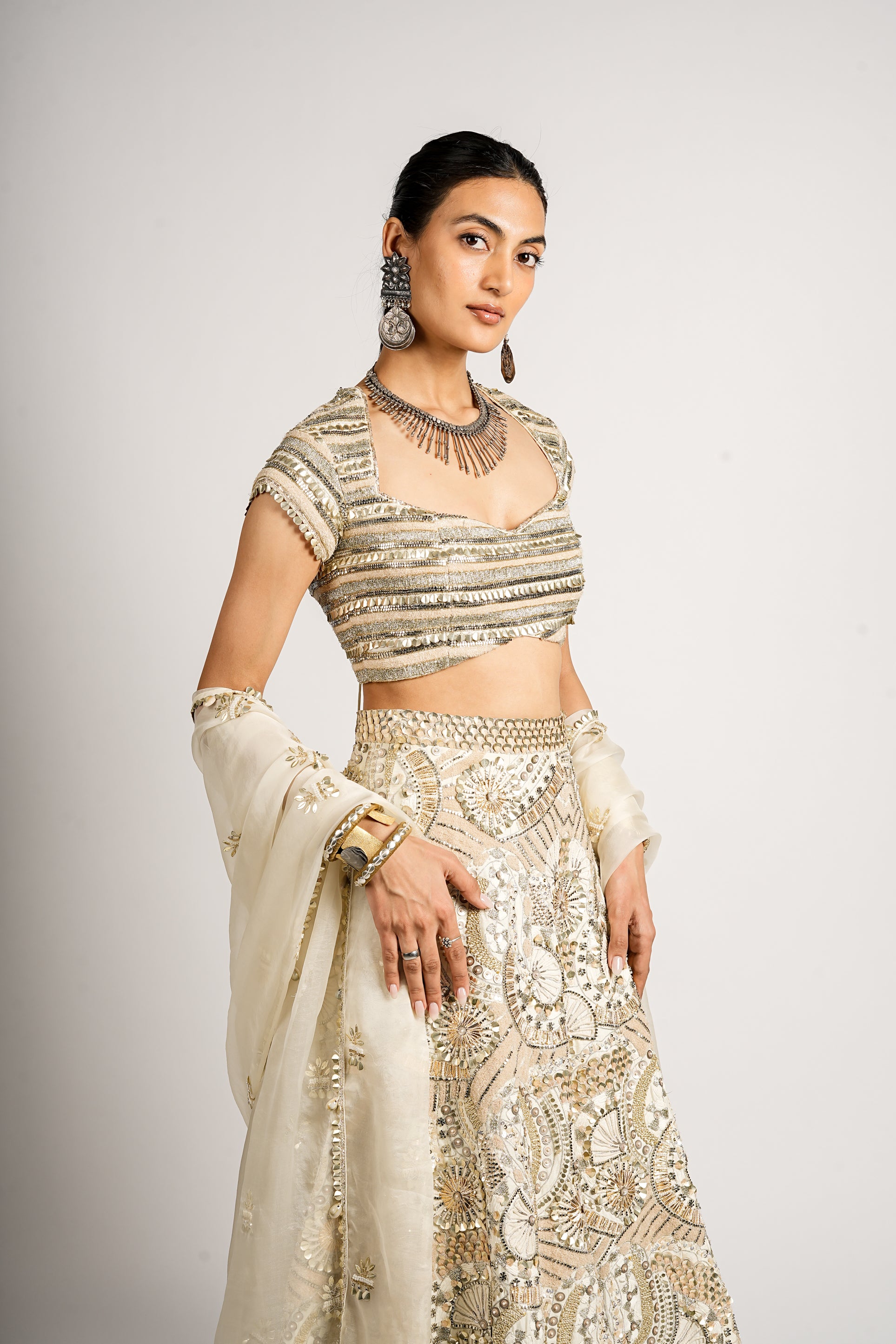 A radiant gold-and-ivory lehenga set featuring intricate sequin and threadwork, paired with a structured metallic blouse and a sheer embellished dupatta. The look blends traditional craftsmanship with a modern, regal shimmer, perfect for a statement festive or bridal moment.