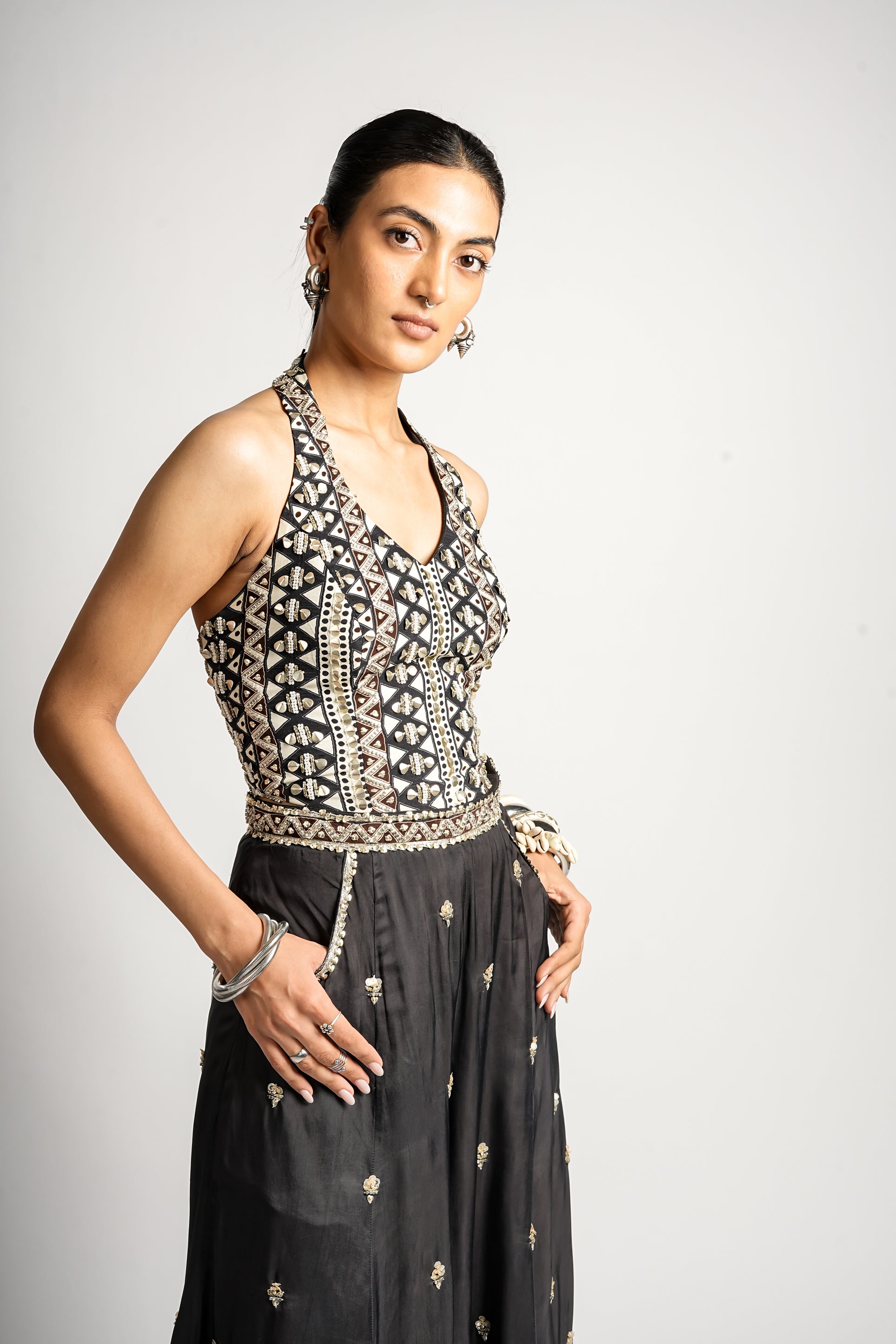 A statement chevron halter-neck bodice, finished with delicate metal and thread work, flows into relaxed wide-leg pants marked with minimal metallic accents. A chic fusion piece that offers comfort without compromising glamour.