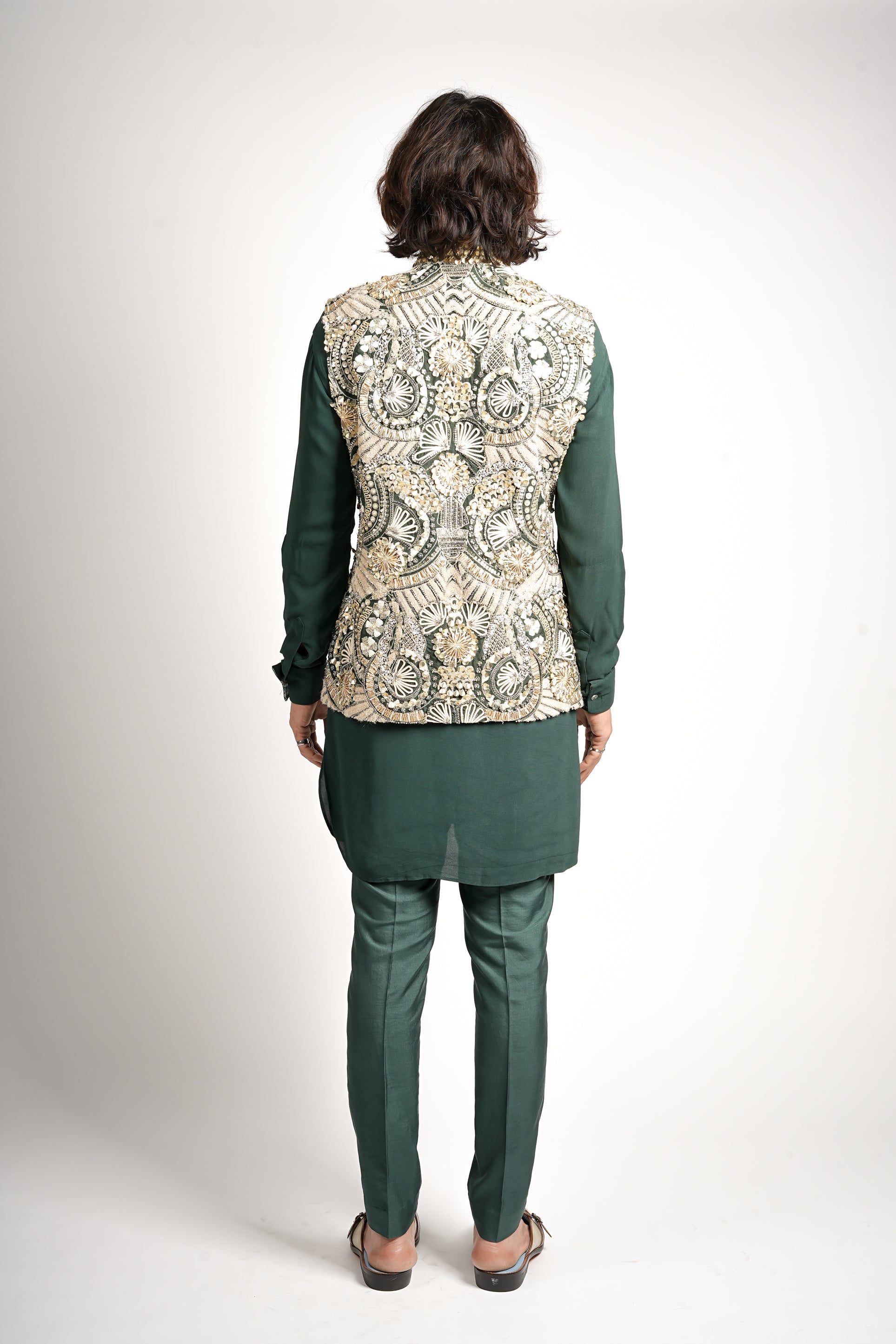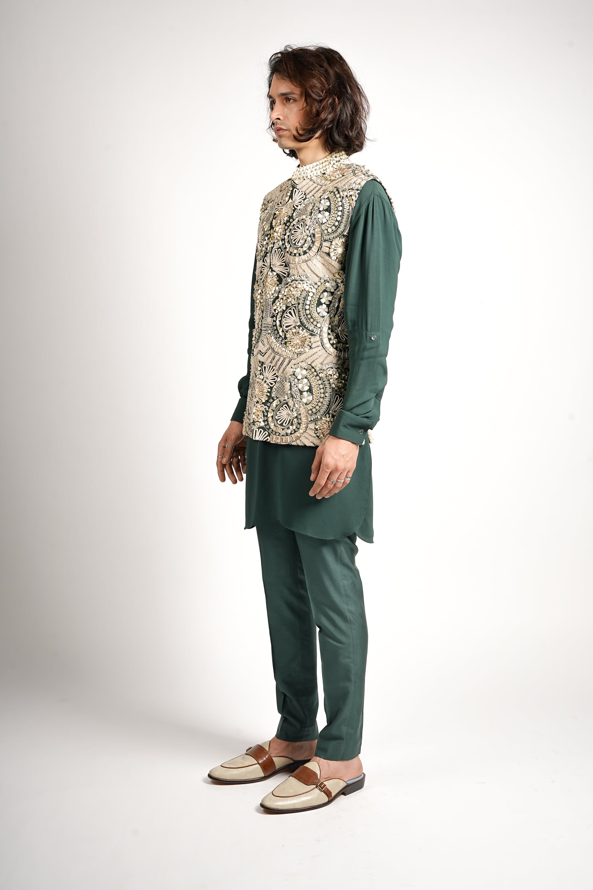 This striking emerald green set with rolled up kurta and pants. The monochrome base is dramatically contrasted with an ornate bundi, richly embellished with dense gold and silver abstract embroidery, creating a lavish and regal ensemble perfect for formal evening events.