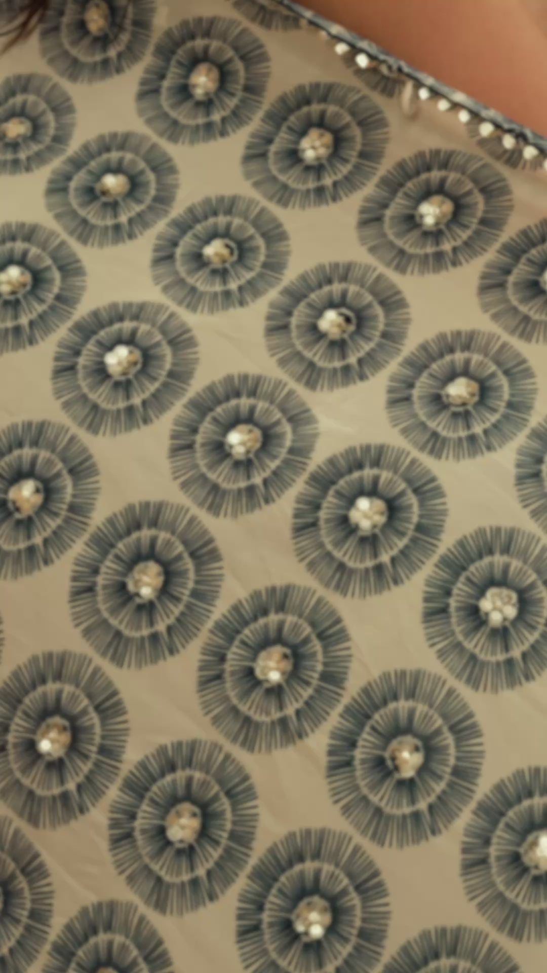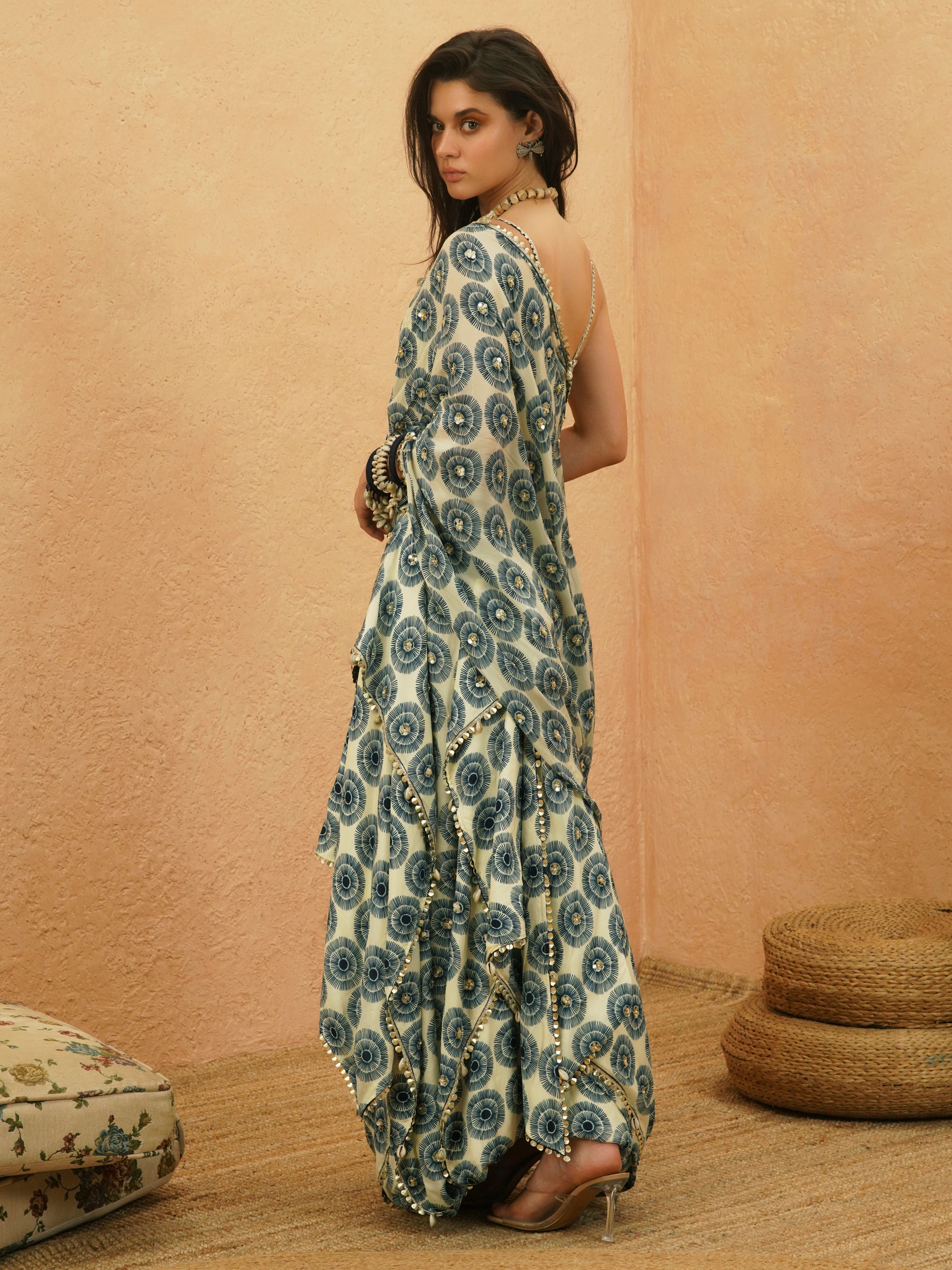 This contemporary drape saree features a protea floral print in muted indigo tones, creating a timeless yet modern aesthetic. Paired with a structured metallic bustier, the look blends traditional elegance with edgy sophistication. The ruffled drape adds fluidity, while shell and metallic accessories enhance its bohemian appeal.