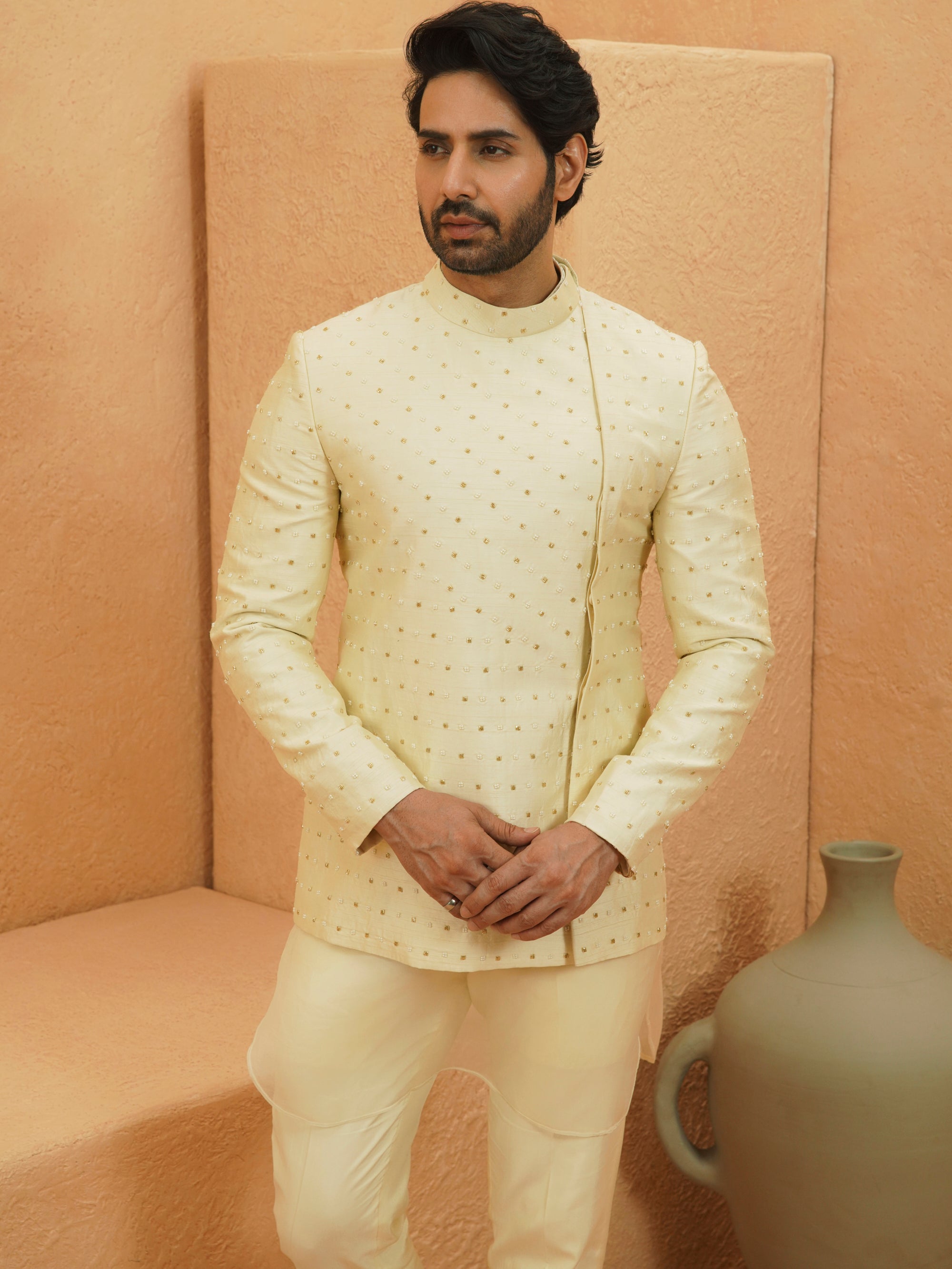 This ivory bandhgala jacket features an asymmetrical closure and subtle gold embellishments, adding a touch of understated elegance. The structured silhouette, paired with a contemporary kurta and tapered trousers, creates a refined look perfect for weddings and formal celebrations.