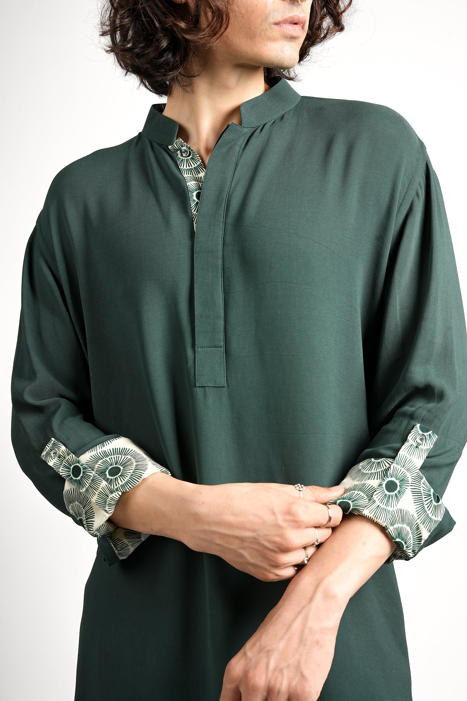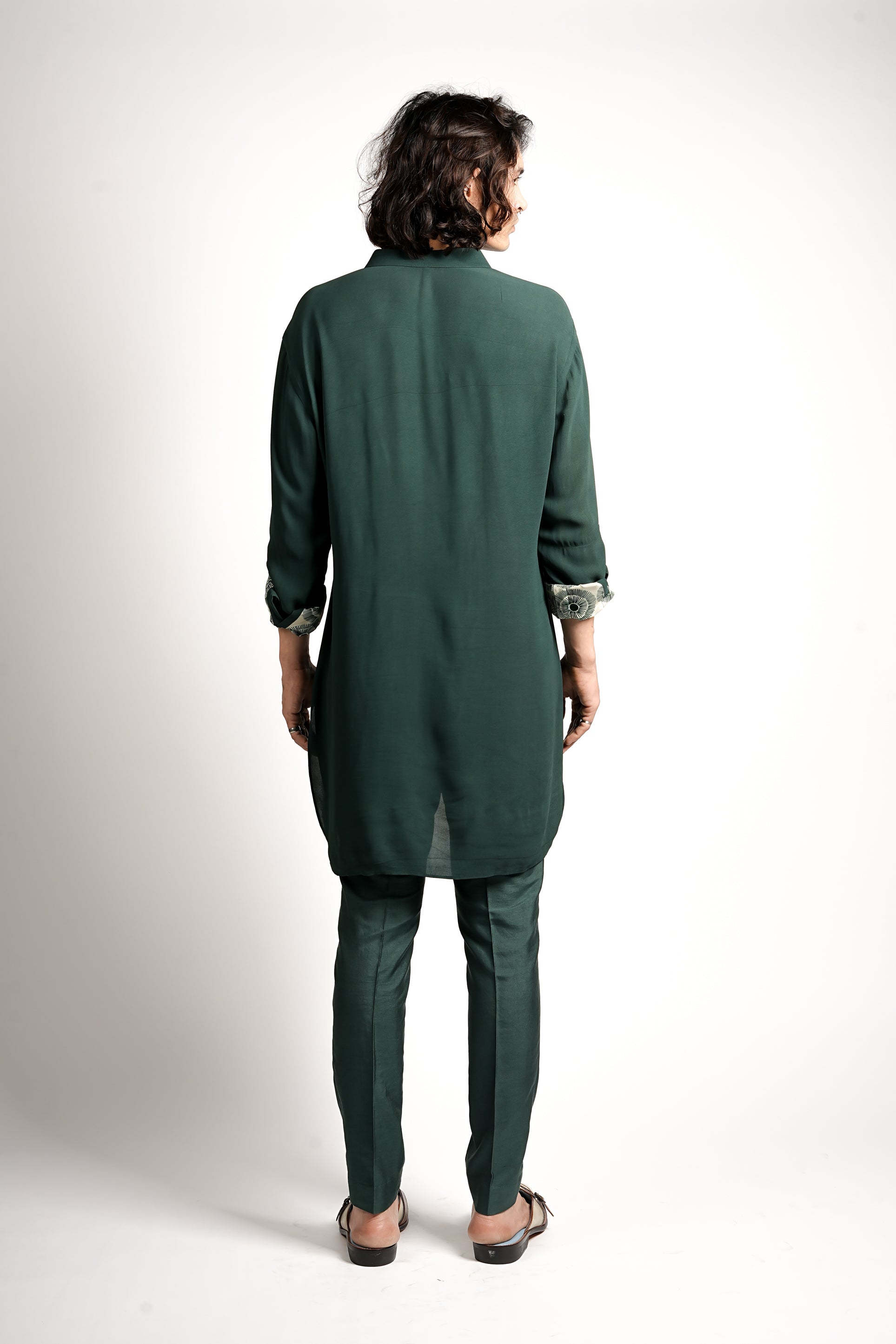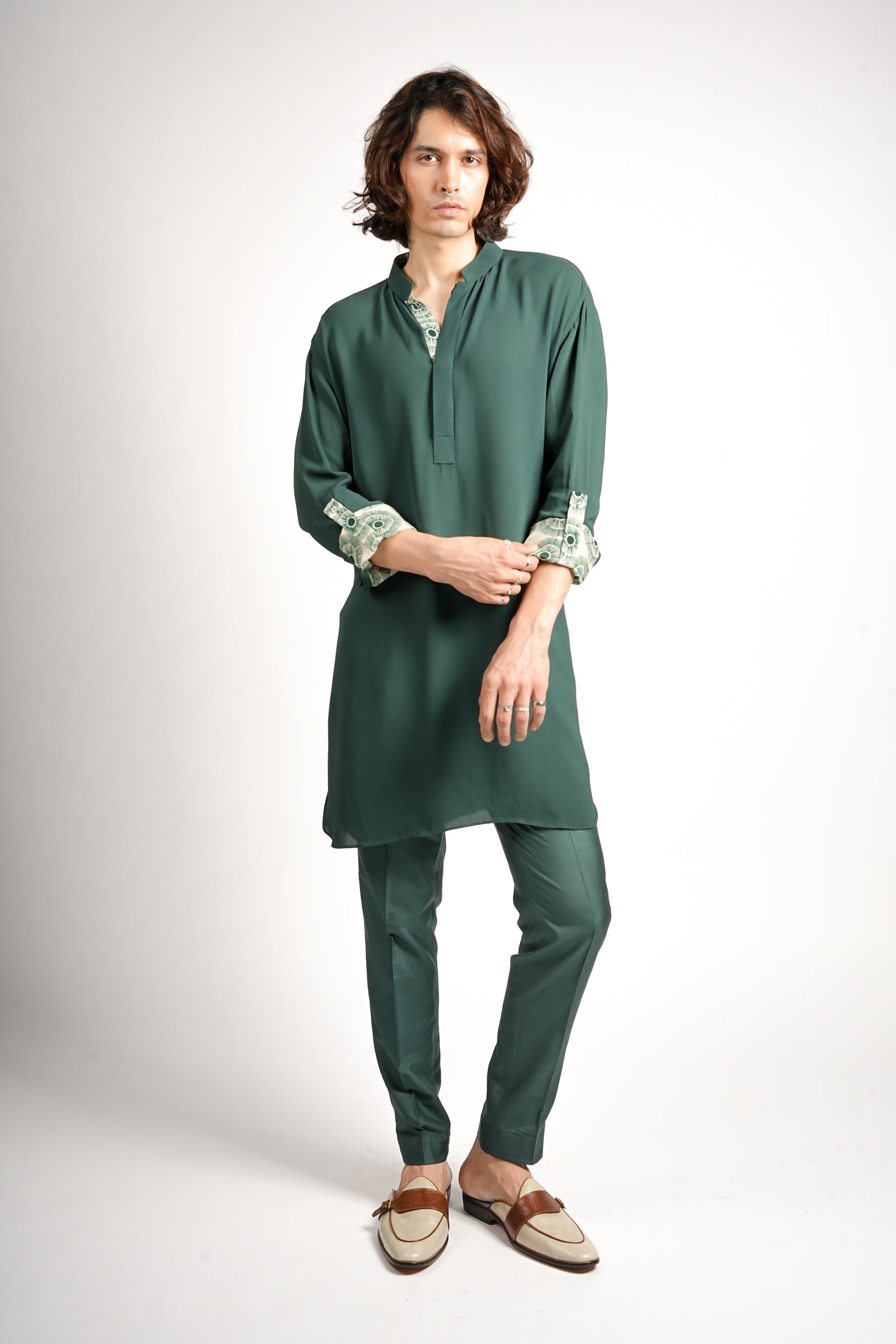 This is a luxurious monochrome kurta and trouser set in an emerald green tone. The collar and sleeve cuffs are detailed with protea motif print, creating a rich, sophisticated, and earthy festive look.