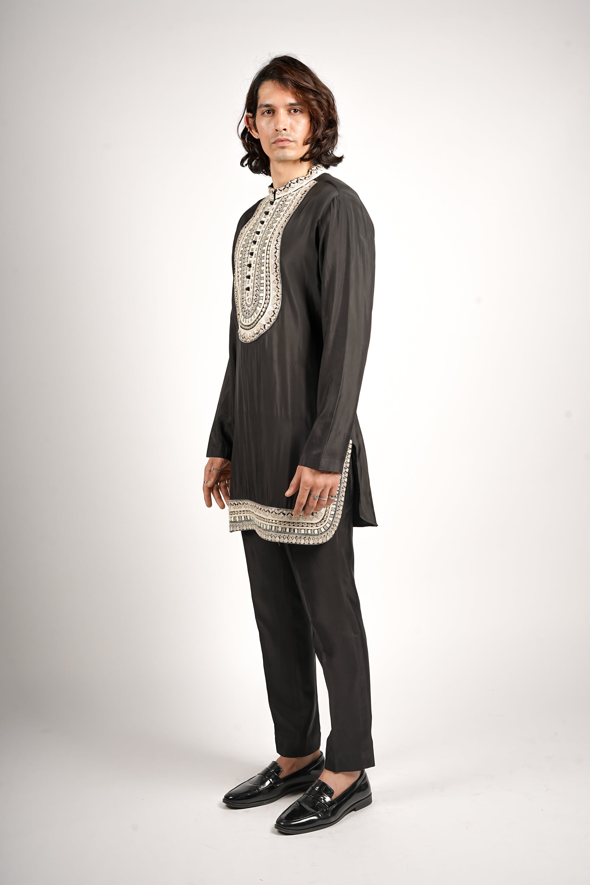 A sleek black kurta set featuring intricate ivory embroidery on the yoke along the neckline and hem. Timeless, refined, and perfect for evening celebrations.