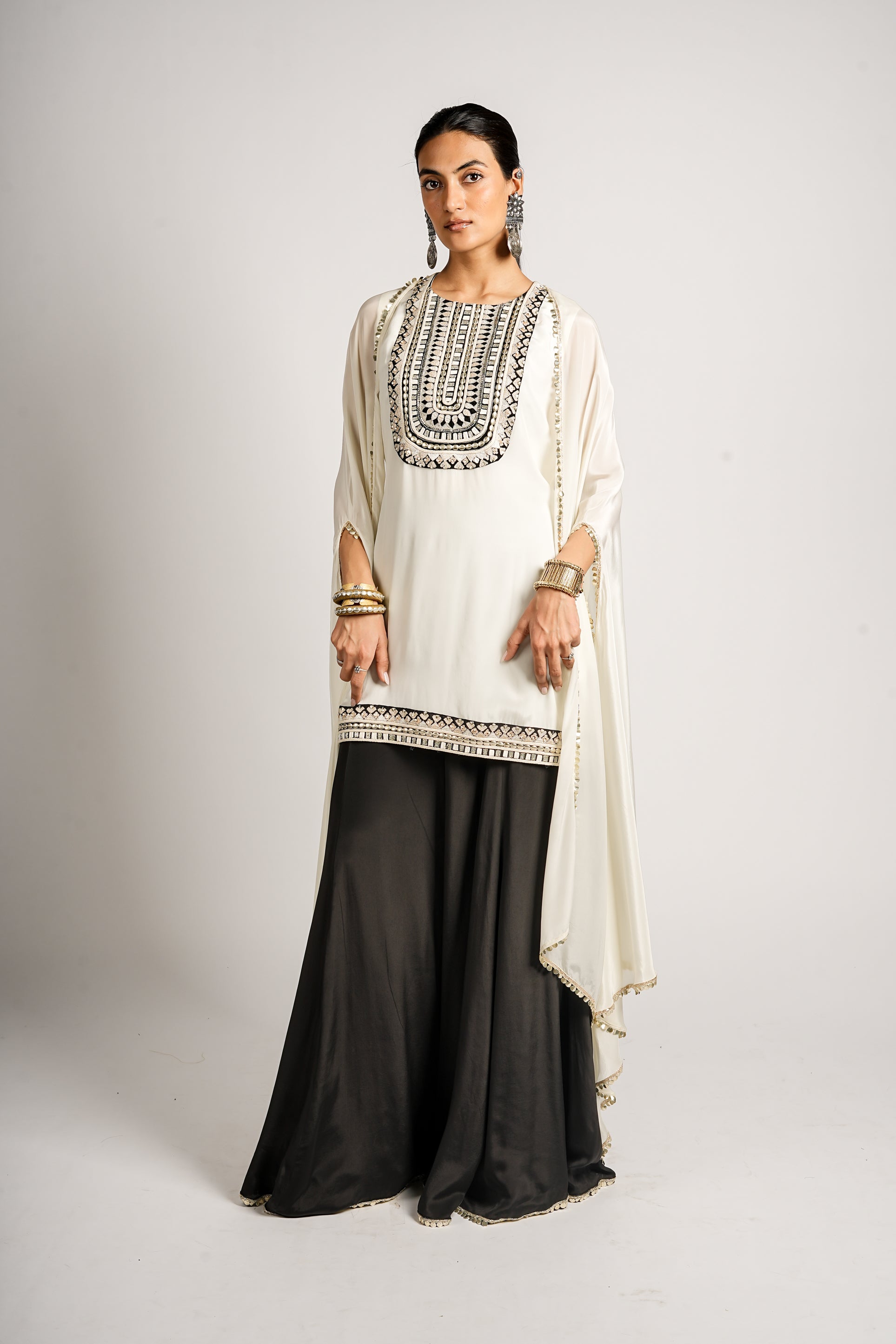 An ivory embellished yoke kurta paired with black flowy pants and a sheer cape overlay, creating a graceful monochrome look with contemporary detailing.