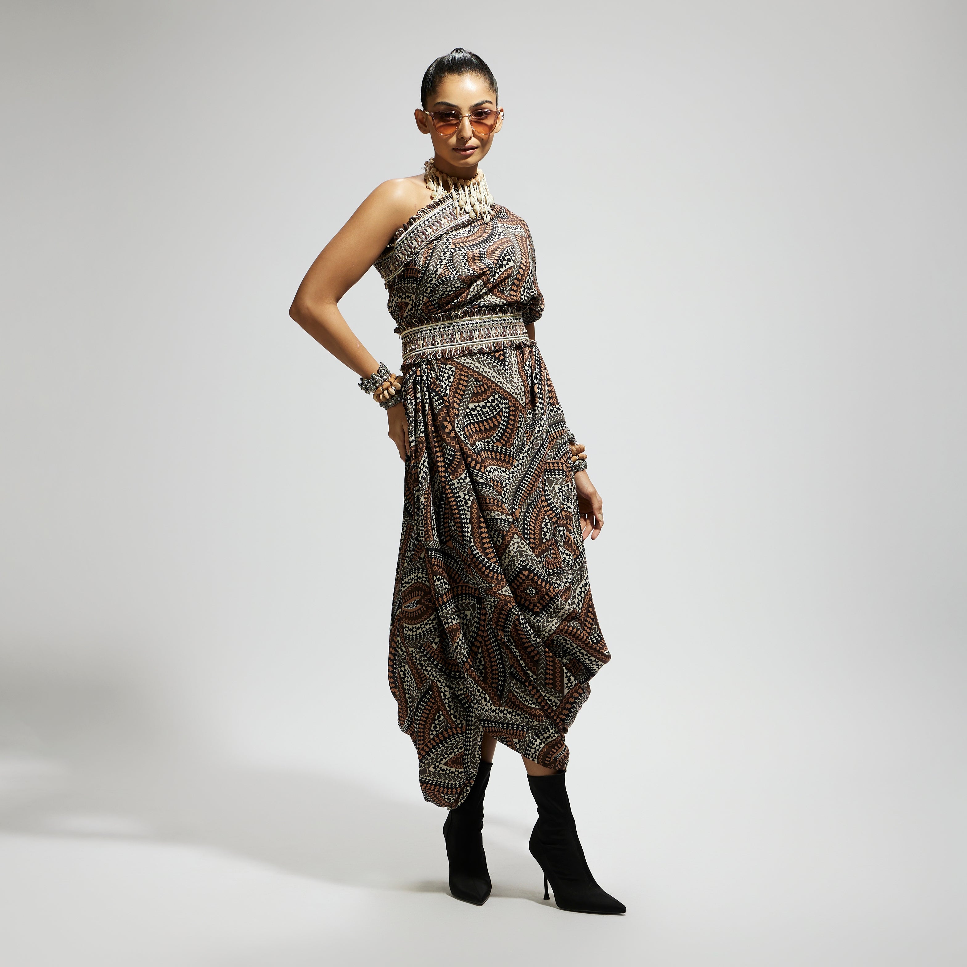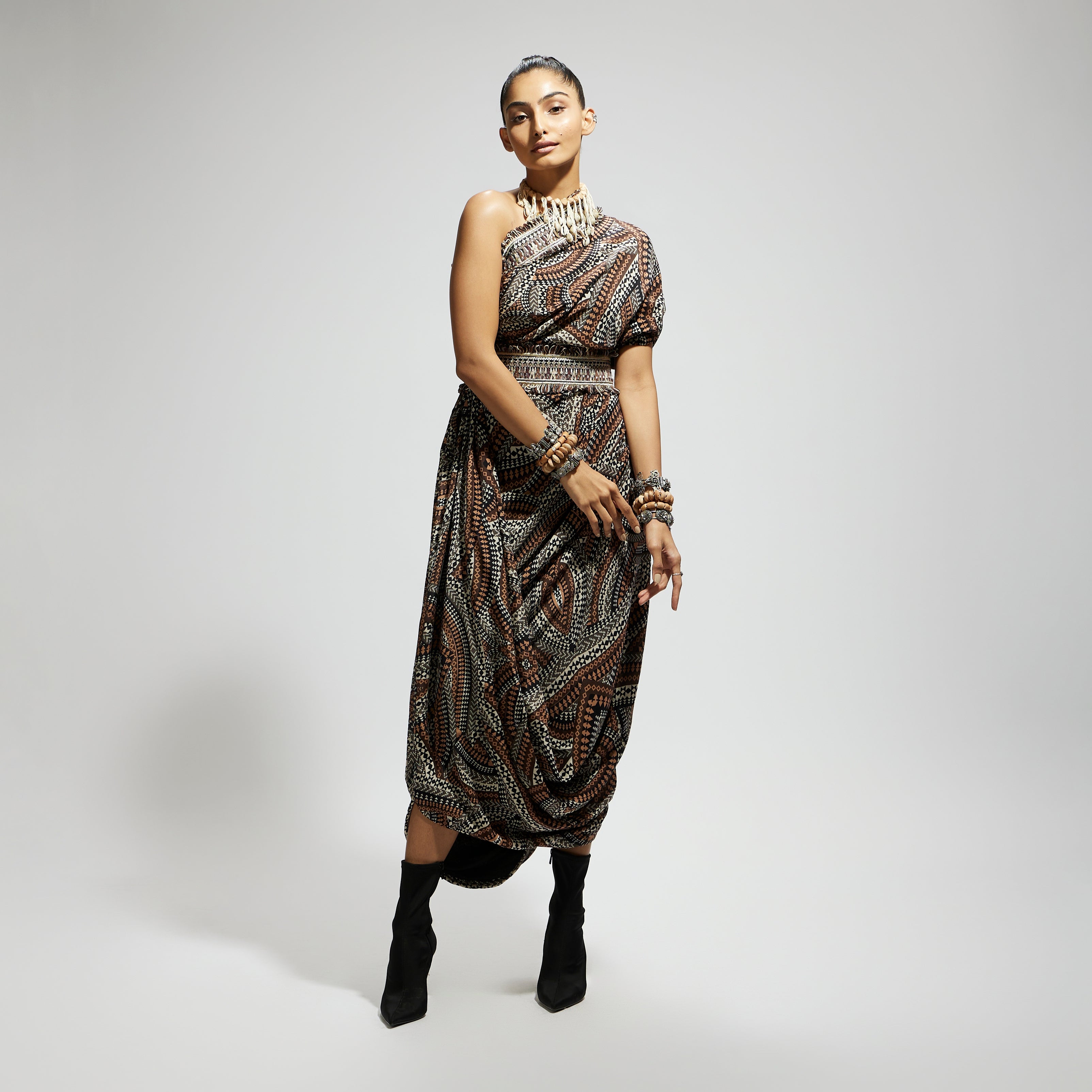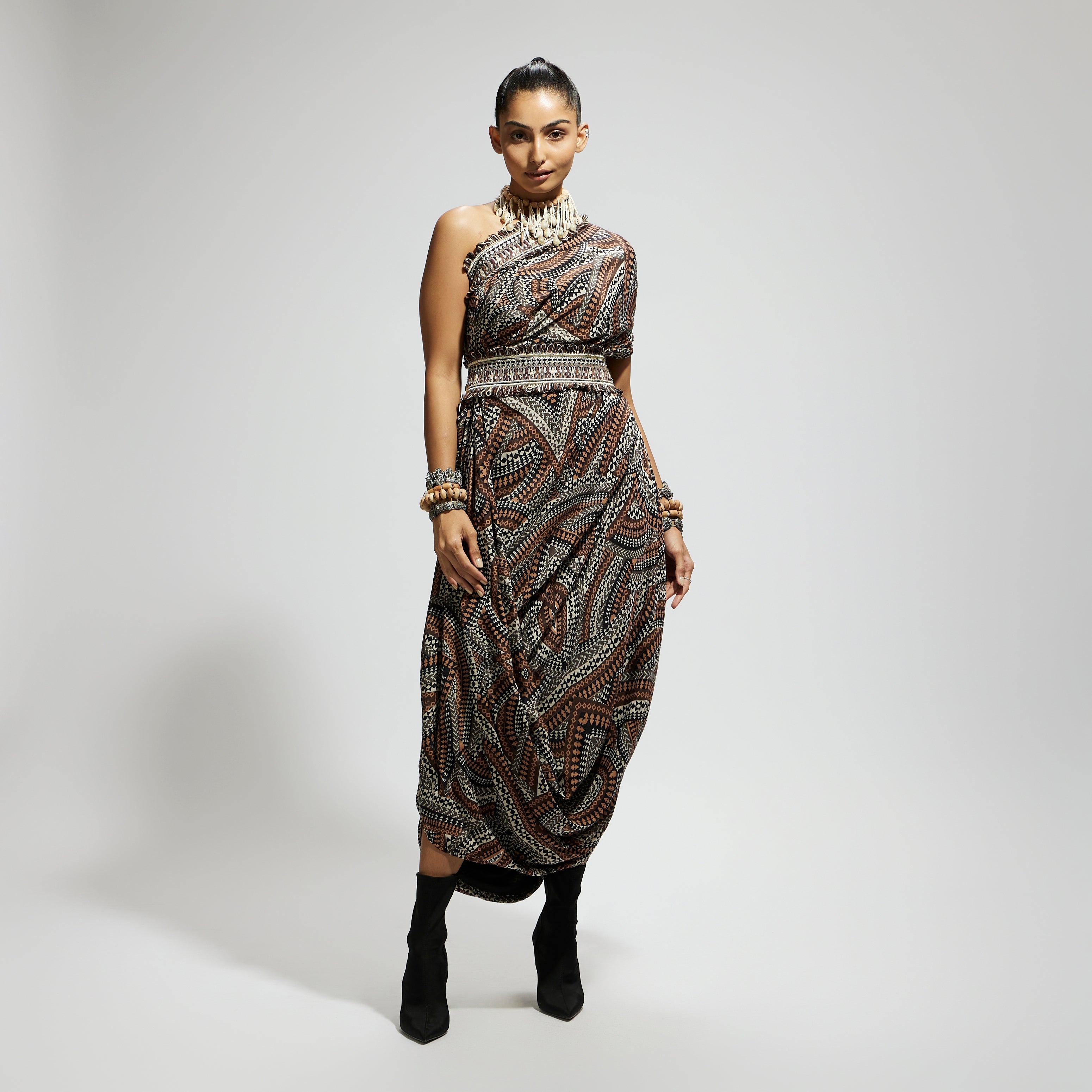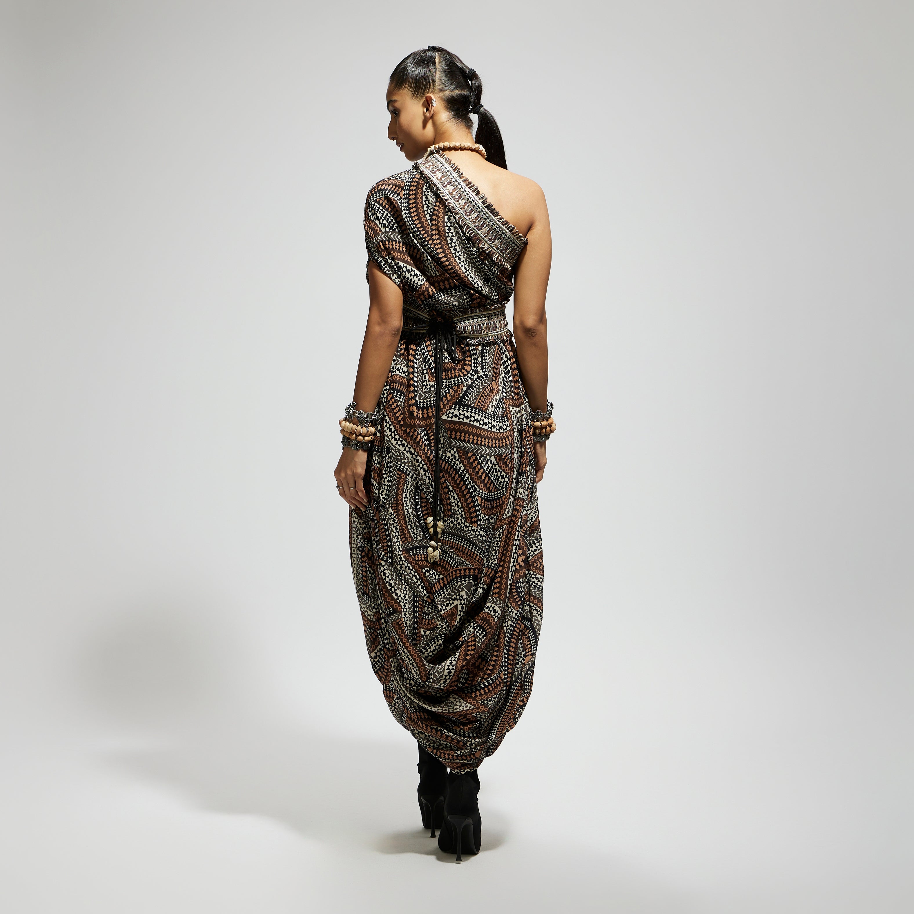 Featuring a zentangle print, one shoulder cowl dress teamed with a belt, Fabric Cepe, Component 2.