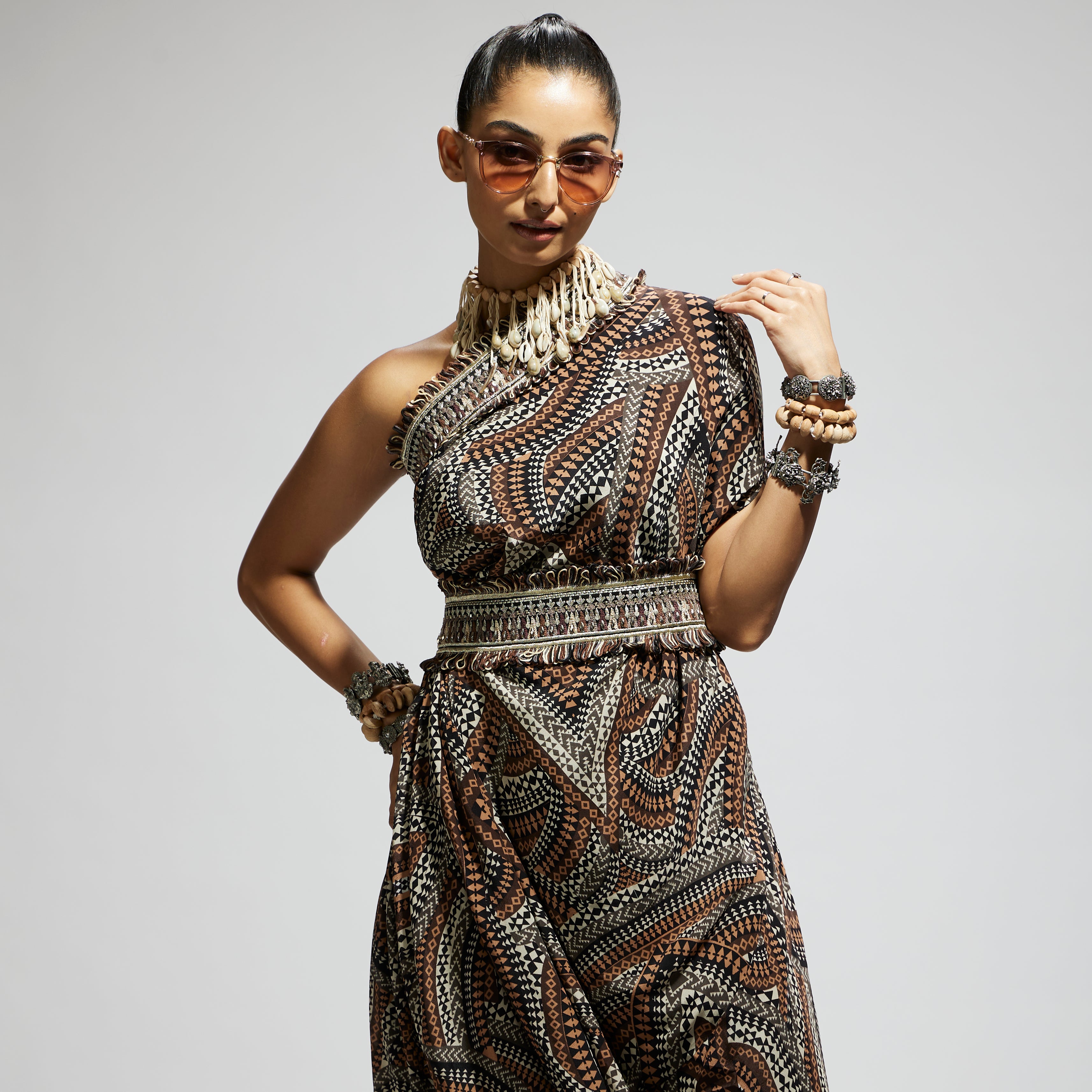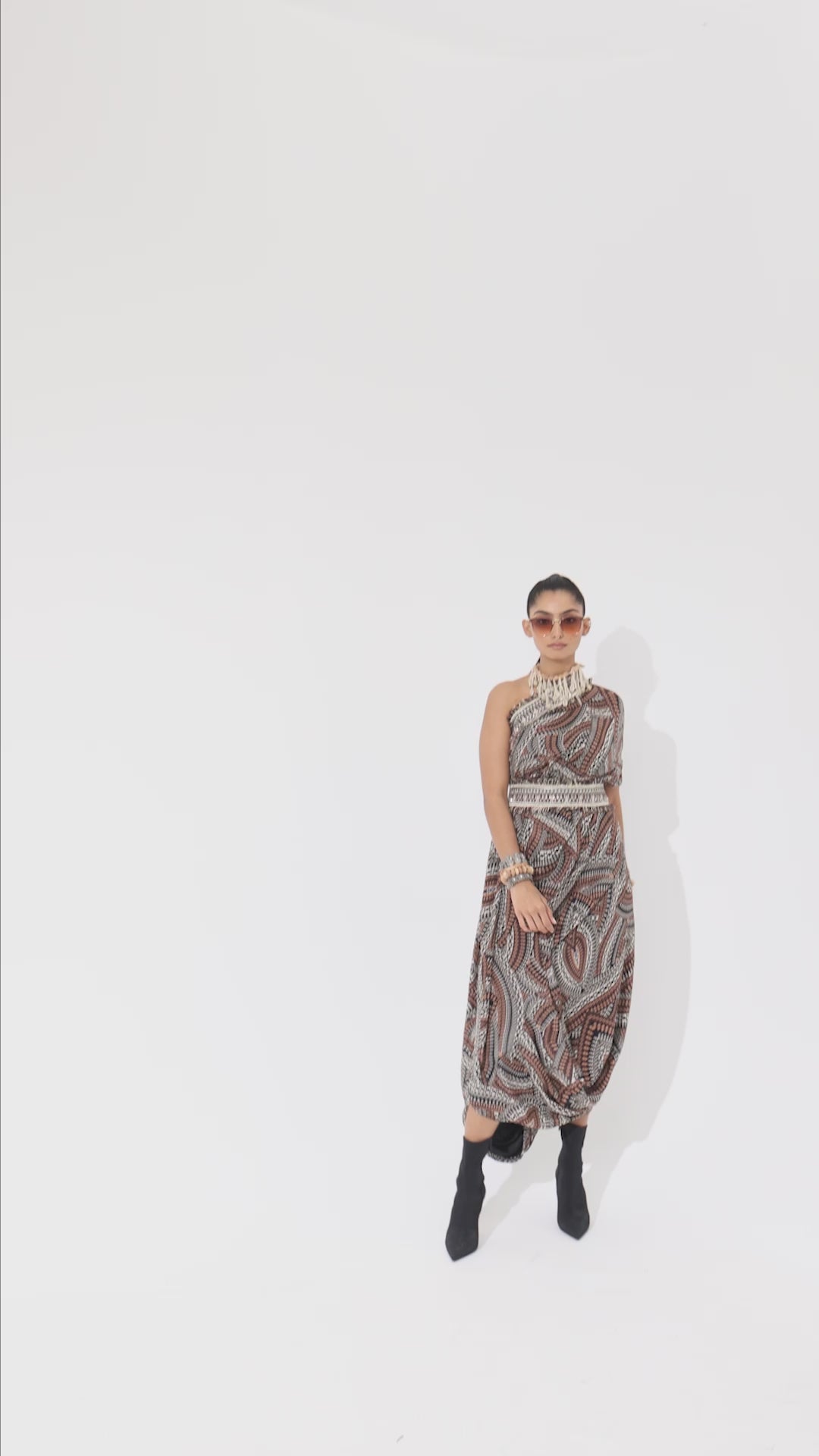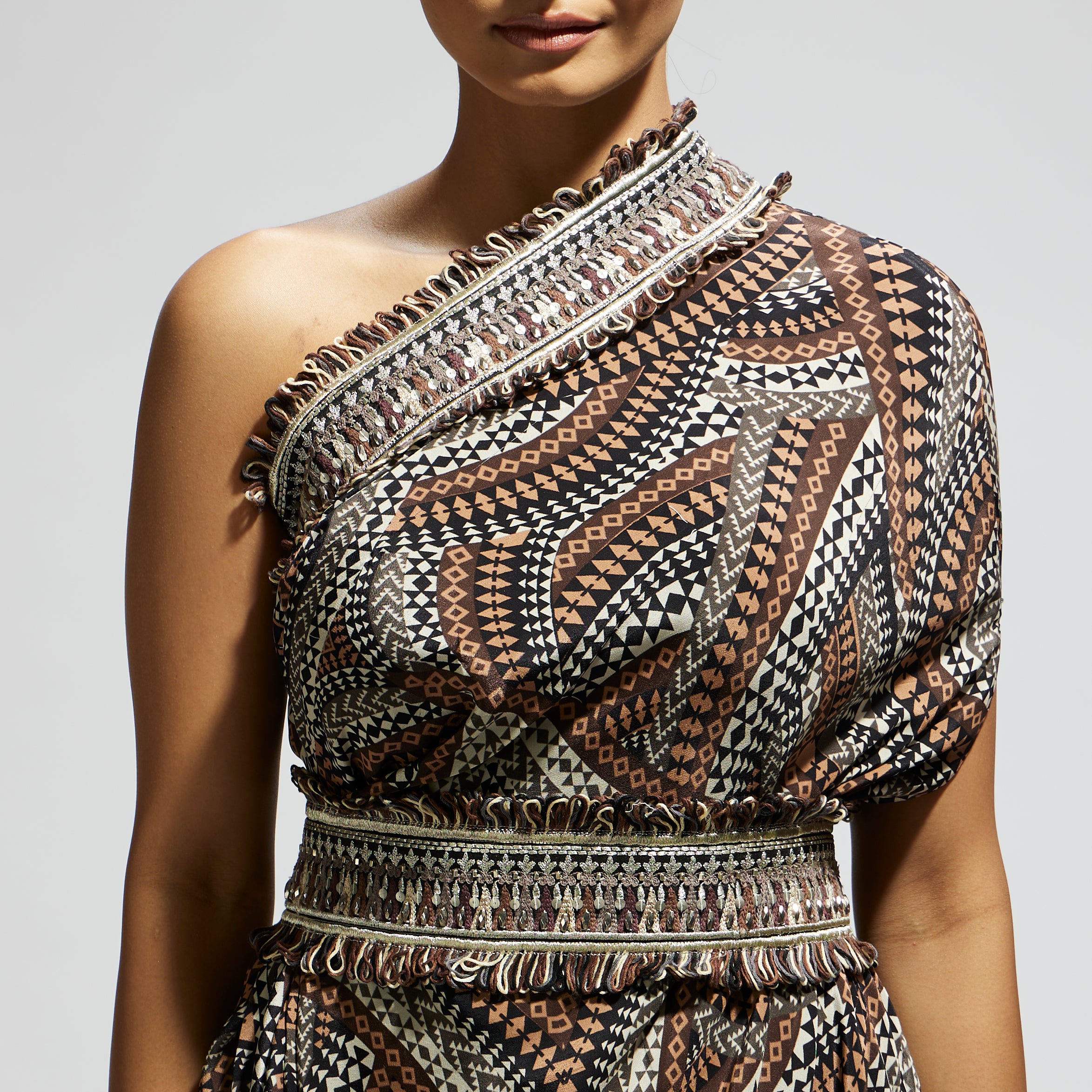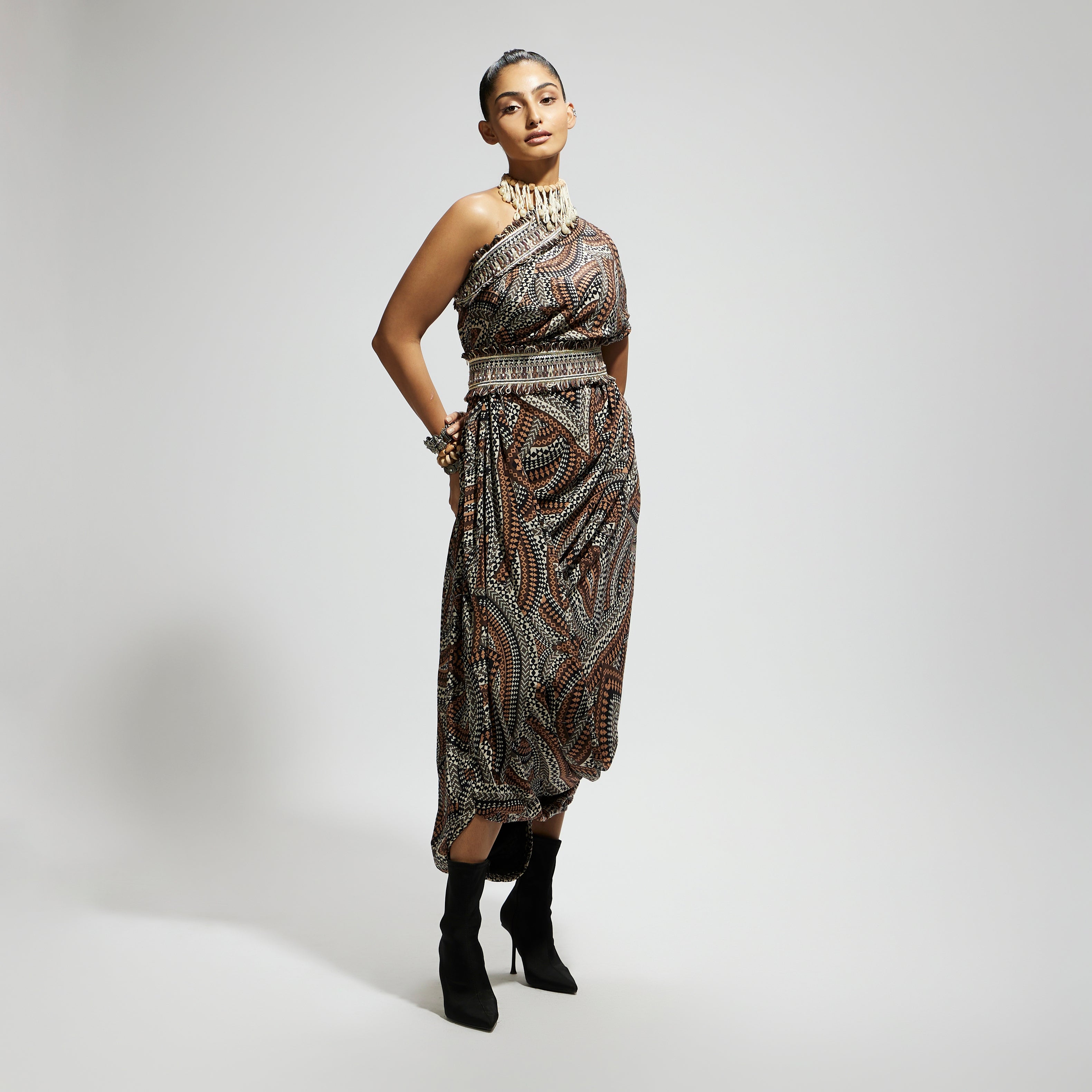 Featuring a zentangle print, one shoulder cowl dress teamed with a belt, Fabric Cepe, Component 2.
