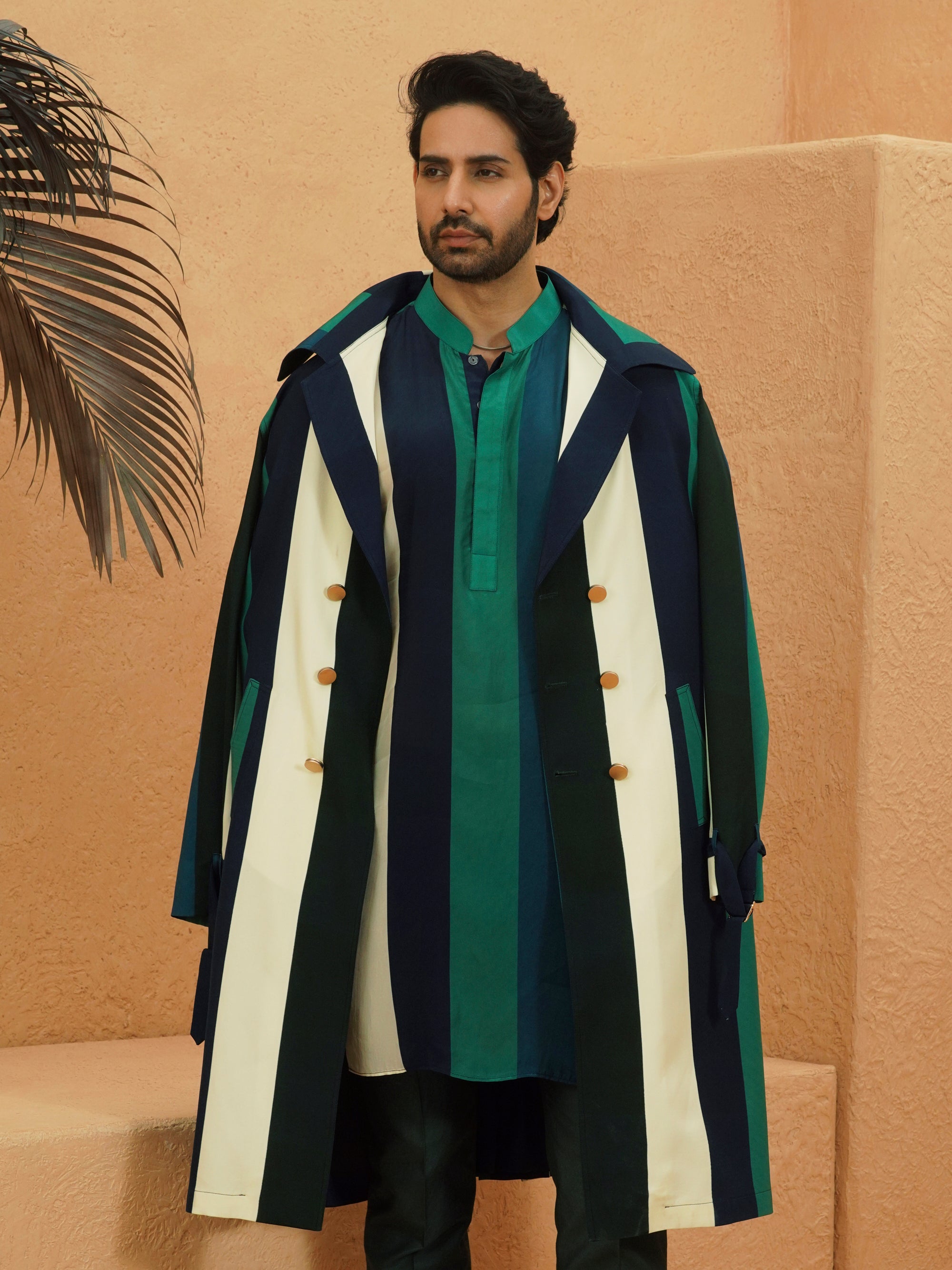 This statement trench coat features bold vertical stripes in rich green, navy, and ivory, exuding a contemporary yet regal charm. The structured silhouette is accentuated with oversized lapels, contrast button details, and adjustable sleeve straps, making it a perfect fusion of classic tailoring and modern aesthetics.