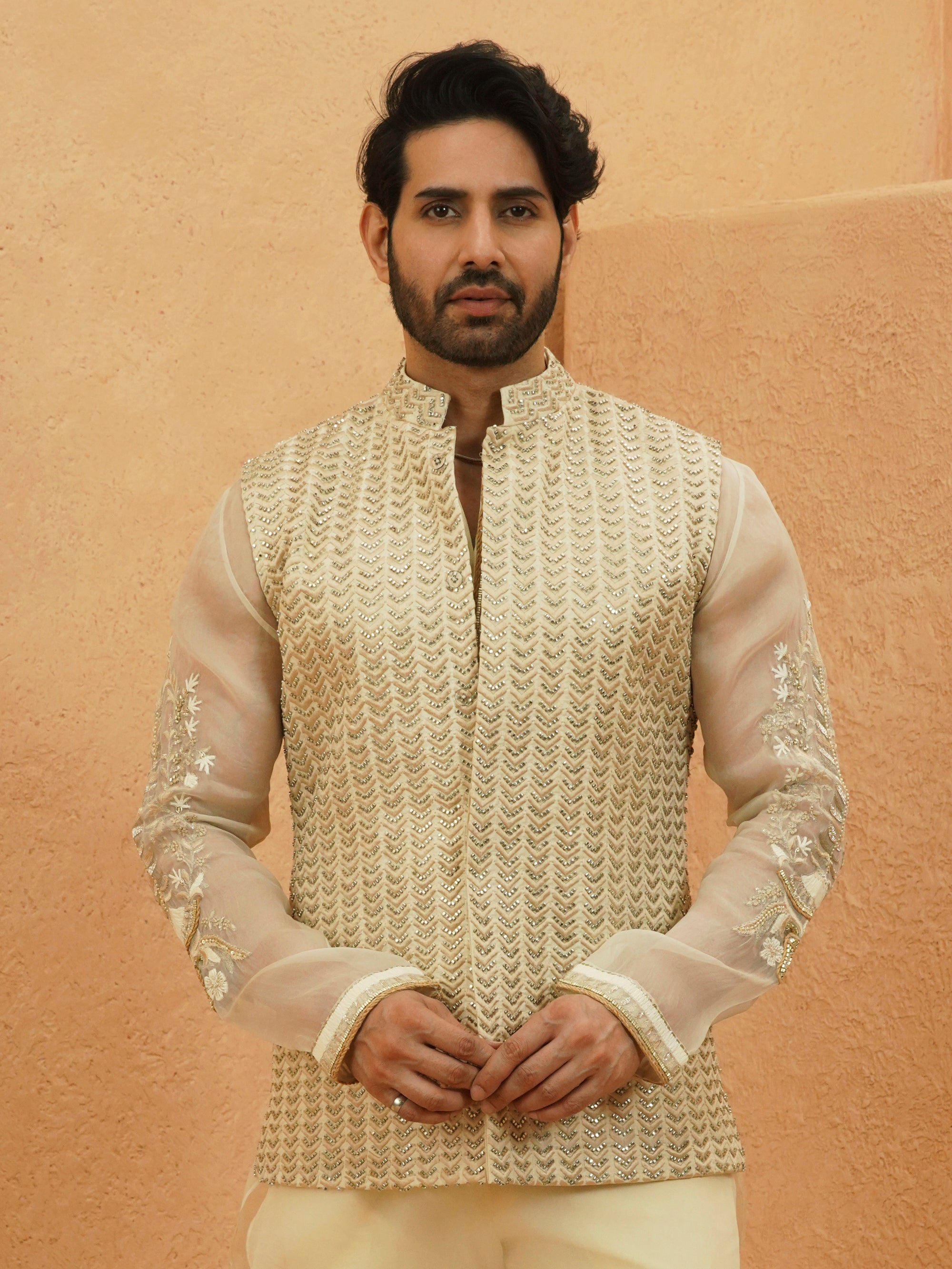 This bundi jacket is a refined masterpiece, featuring intricate chevron textured embroidery in a soft ivory hue. The structured silhouette enhances the regal appeal, while the high-neck design adds a touch of sophistication. The delicate yet detailed craftsmanship showcases a blend of tradition and modern elegance, making it an ideal layering piece for festive occasions, weddings, or formal celebrations.